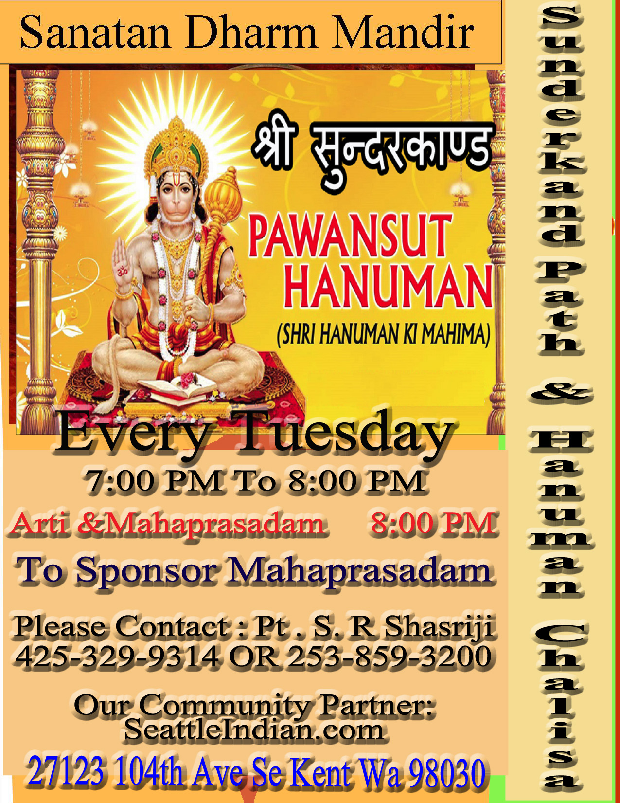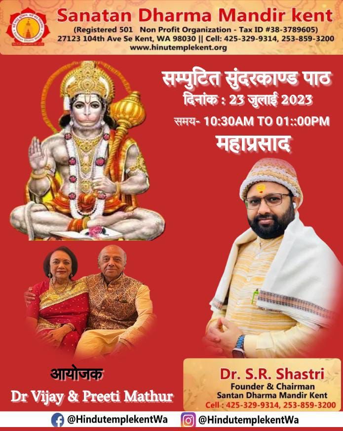 - Tuesday – 6:30 – 8:00 PM Ramayan Path/Hanuman Chalisha