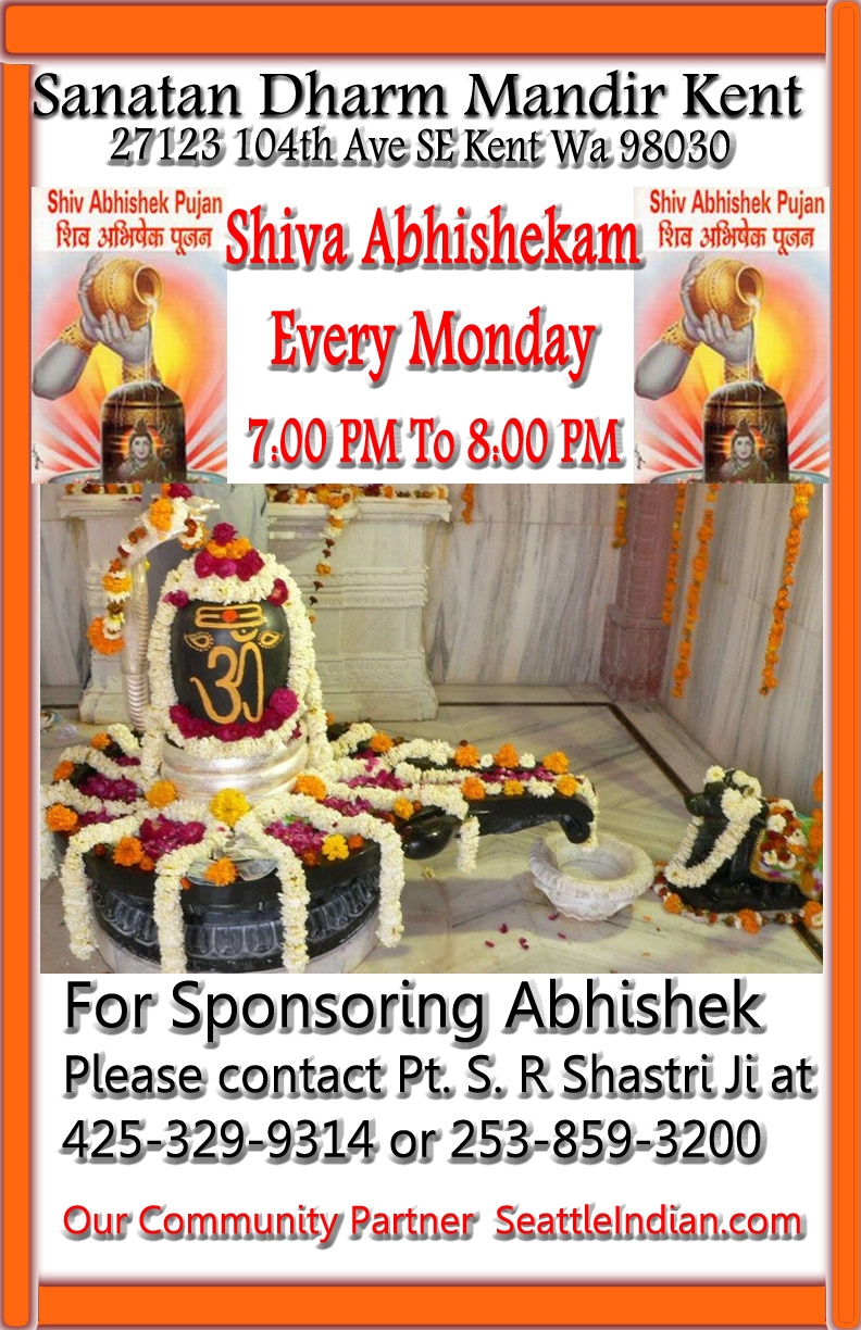 - Monday – 6:30 — 8:00 PM Shivaling Abhishekam