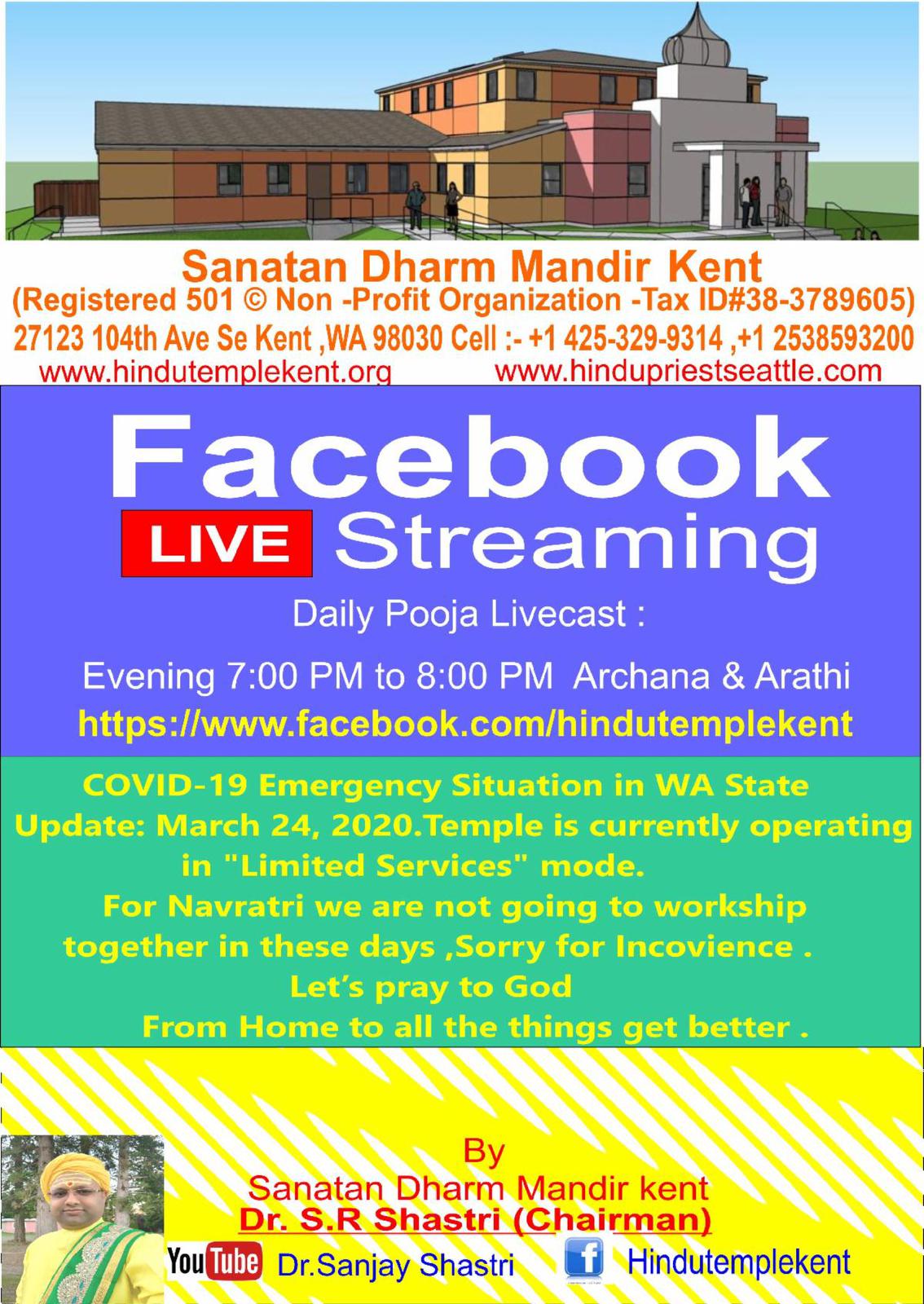 - Daily Aarti : Prabhat — 11:30 AM & Sandhya – 7:00 PM